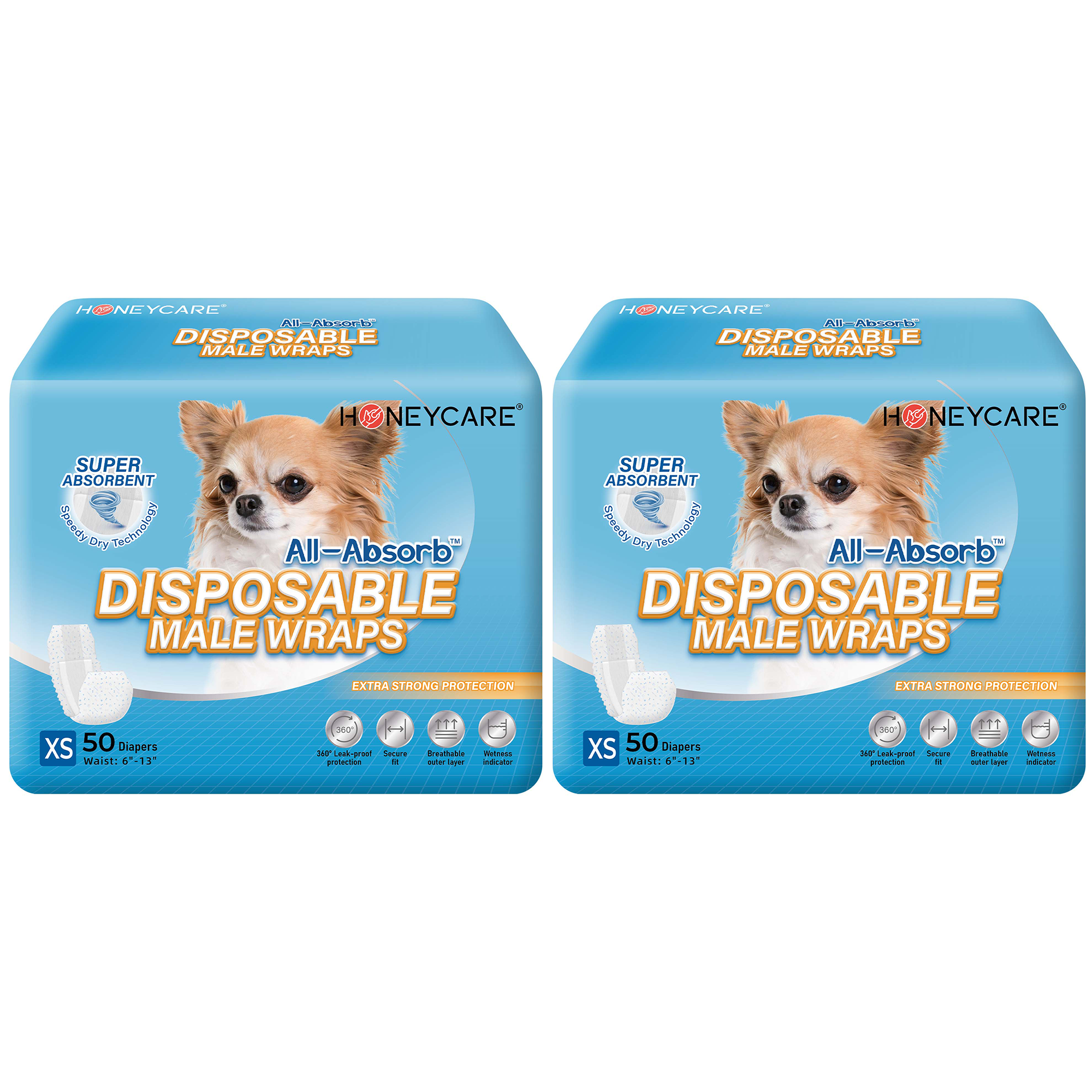 DRY AS A BONE - All-Absorb Male Wraps have 360 degree leak-proof protection barriers, and a super absorbent core which prevents any unwanted spills or accidents where you don't want him to mark